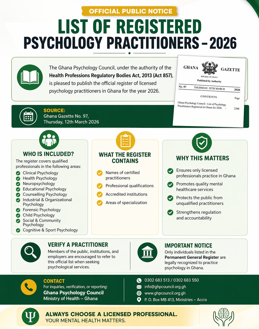 PC is an independent quality and standards organisation, appointed as an external accreditation entity for the Psychology Profession in Ghana under the Health Professions Bodies Regulation Act 2013 (Act 857). PC develops and reviews accreditation standards for psychology programmes of study in Ghana. We then work with National Accreditation Board, education providers and use the accreditation standards to determine whether programmes of study for students seeking to practice as a registered psychologist, paraprofessional and lay practitioner in Ghana meet the required education standards. GPC accredits all applied psychology programmes of study in the country